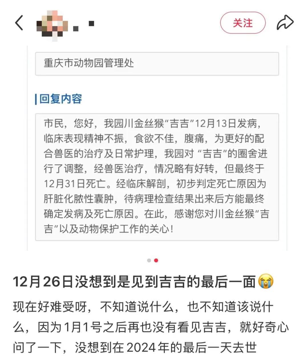 1月13日,@重庆动物园 发布讣告,称该园金丝猴“吉吉”于2024年12月31日不幸死亡。